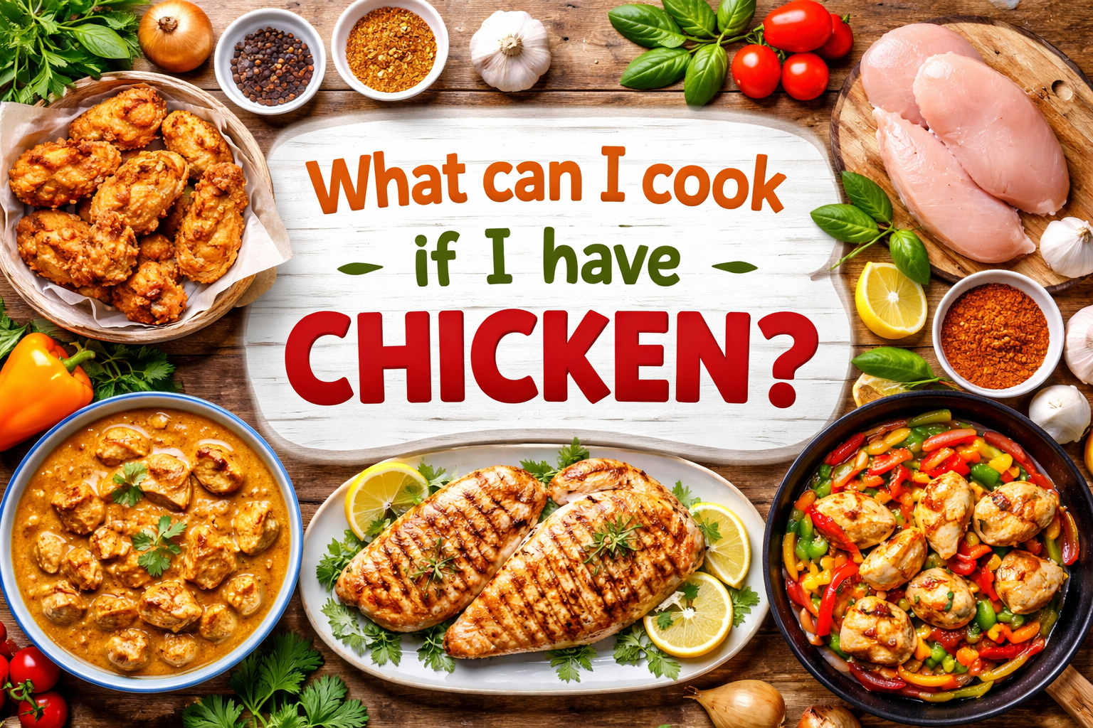 If your question is still What can I cook if I have chicken? here are some simple ideas. Chicken curry is one of the easiest recipes. You just need chicken, onion, tomato, garlic, and spices. Cook everything together and your tasty meal is ready.